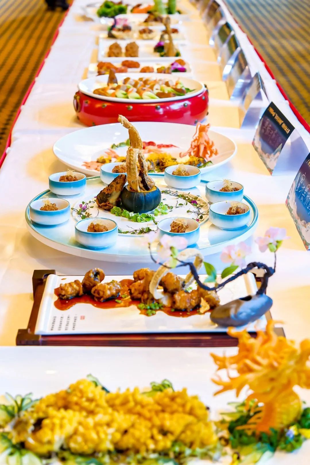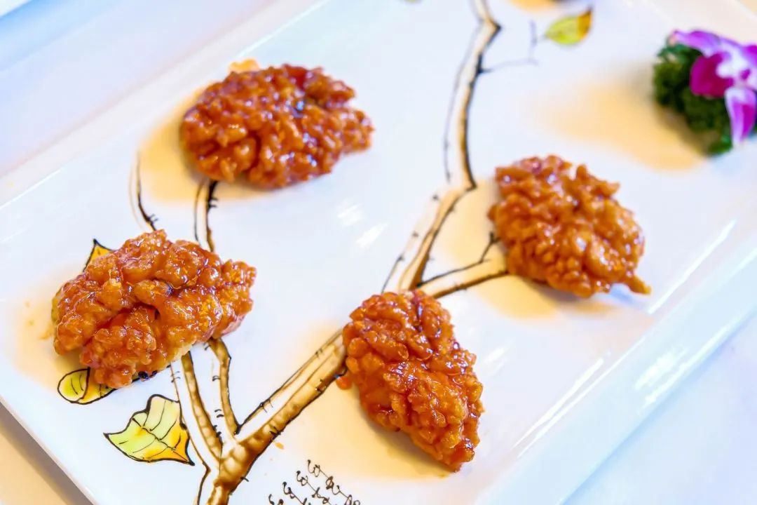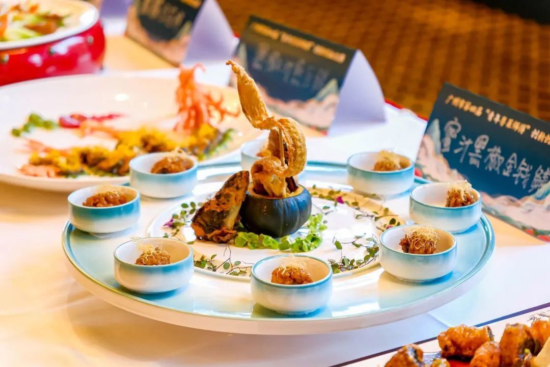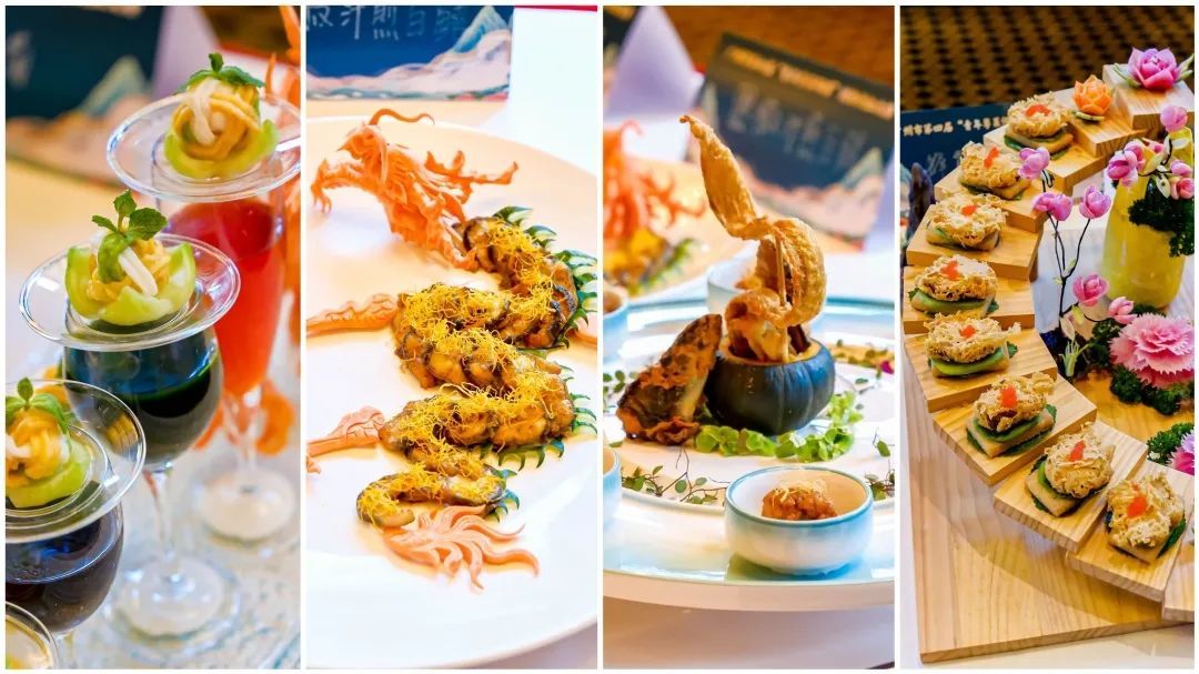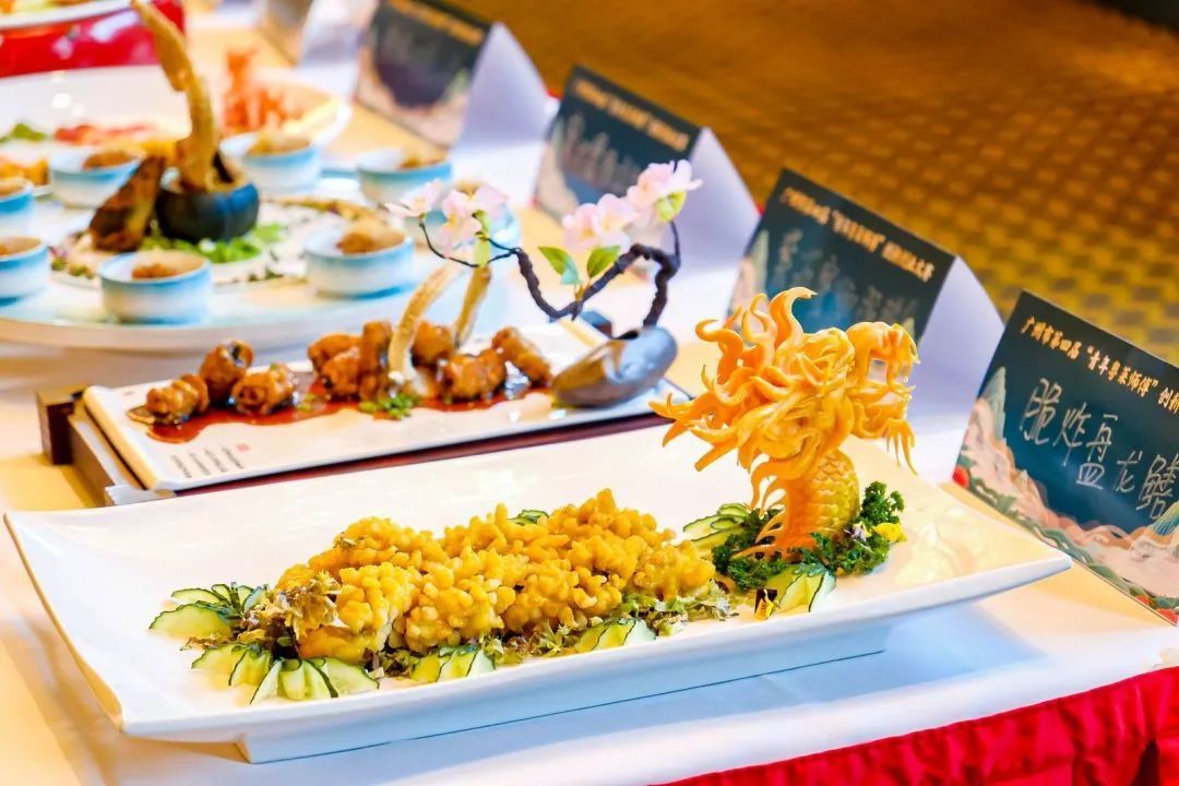 经过一番煎、炸、烹、煮、炖、焖、焗,“锅光勺影”之间,一道道色彩分明、切工细致、摆盘新颖的佳肴呈现在大家眼前。蜂巢紫苏牛仔粒、书香秋菊、八宝乾坤鸭、金凤朝阳、疍家咕噜凤尾虾、招财玉臂龙……在作品展示区,各式菜品琳琅满目,香味弥漫,让人垂涎欲滴。