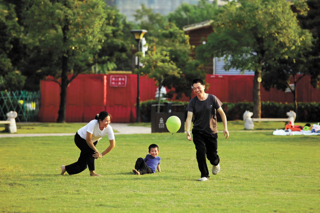 △广州秋日暖阳中,家长和孩子玩气球。(图/广州日报·新花城记者:骆昌威)