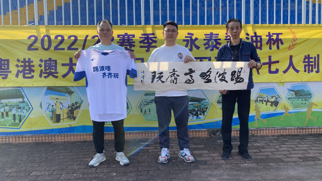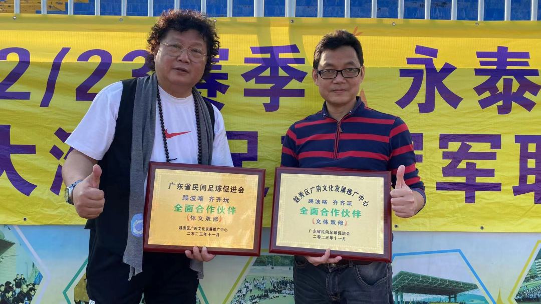 在增城与东莞一战之后,广东省民间足球促进会与广府文化发展推广中心缔结了全面合作伙伴关系。广东省民间足球促进会执行会长、粤港澳大湾区足球冠军联赛(七人制)组委会主任王军与广府文化发展推广中心理事长冯坚勇互相交换纪念牌匾。广府文化发展推广中心艺术顾问谢峥嵘向广东省民间足球促进会赠送了“踢波咯,齐齐玩”书法作品一幅。