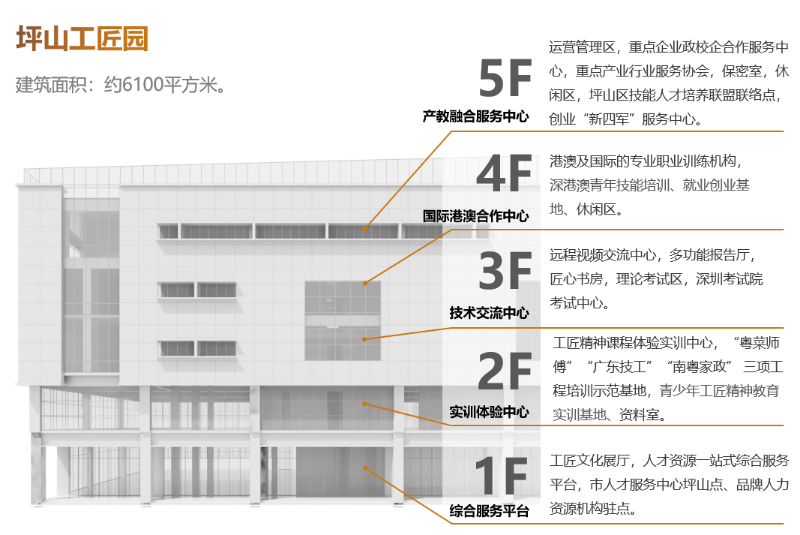 一层定位为综合服务平台,设有工匠文化展厅、人力资源综合服务平台等,二楼为实训体验中心,三楼为技术交流中心,四楼为国际港澳合作中心,五楼为产教融合服务中心。