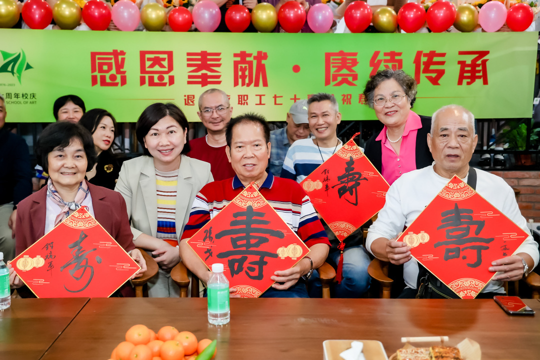 在艺苑展厅,学校邀请书画名家现场挥毫,书写不同版本的“寿”字,赠送给学校近两年满70岁高龄的教职工。广州市艺术中学党总支书记秦小珊代表学校领导班子和在职的教职员工向学校70岁高龄教职工表示最诚挚的祝福和最崇高的敬意,“祝福各位老同志晚年生活如诗如画,如歌如梦,幸福长寿,健康常乐!”