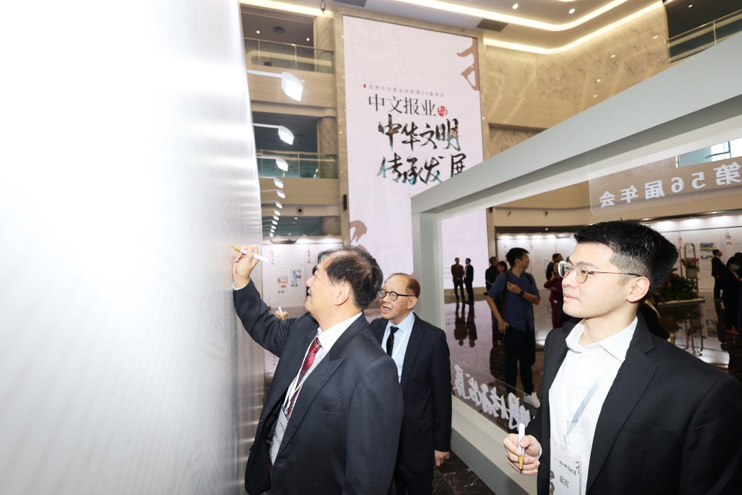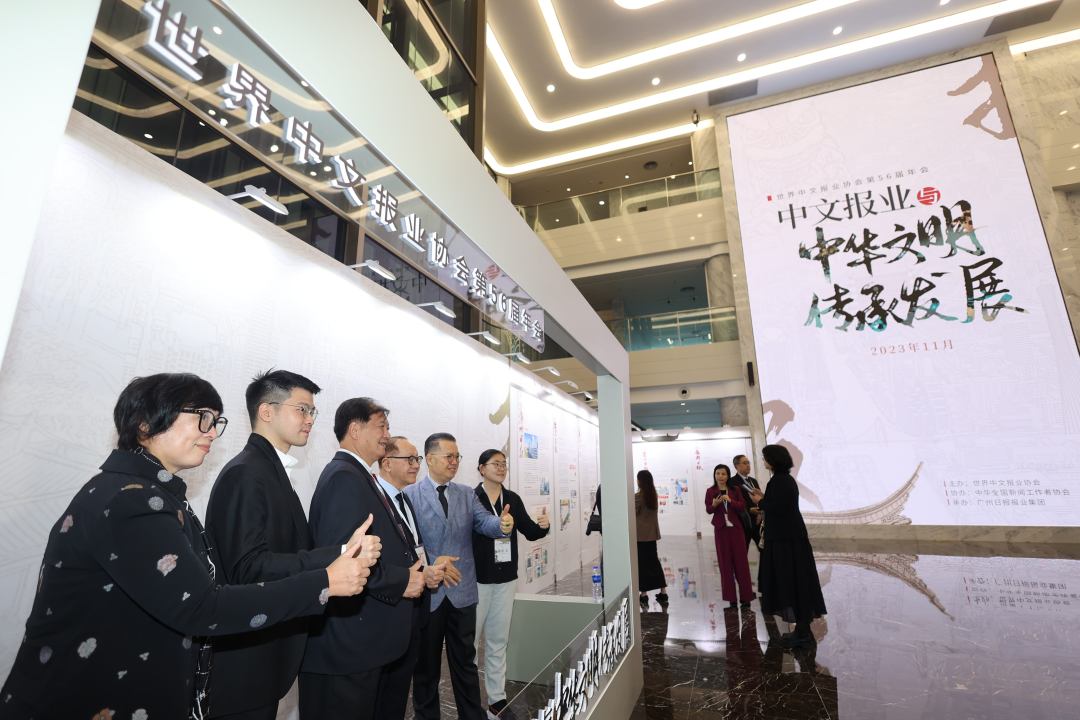 上午9时许,世界中文报业协会第56届年会参会嘉宾,一同走进广州报业文化中心,参观本届年会媒体风采展。在展览里,历届年会主题一目了然。《广州日报》《光华日报》《明报》《联合报》《澳门日报》……展览中,数十家中文报业图文展板,向观者展示每家媒体的基本情况和风采。许多参会嘉宾看到所在报业的展板后,开心地与同事、同行一起合影。