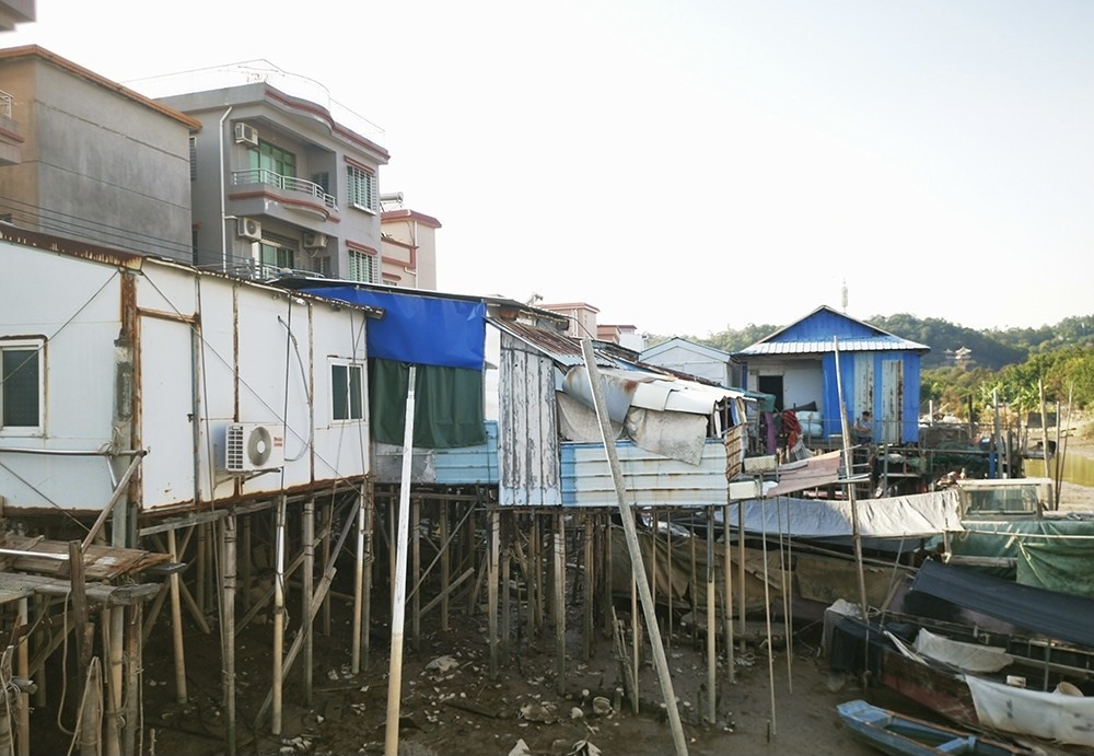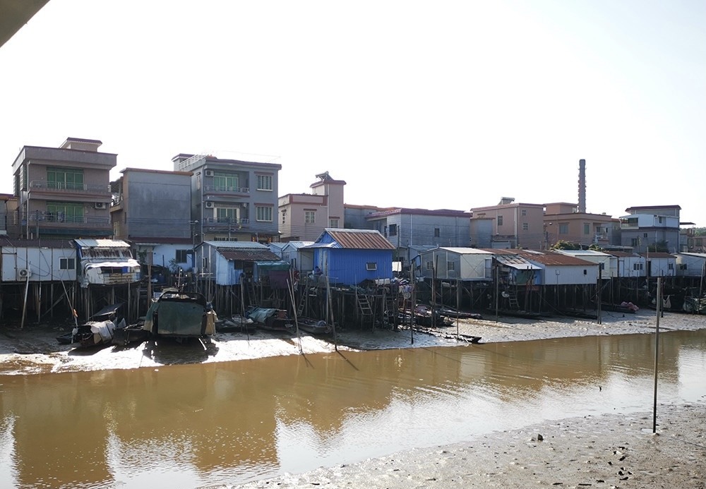石楼镇群星村上涌街的上涌水闸旁,河岸搭建密密麻麻的棚房,这些棚房占用河道,显得简陋又陈旧,大多数是由几根木桩或水泥柱扎进一片布满厚厚淤泥的滩涂上作为支撑,用木料和铁皮搭建。