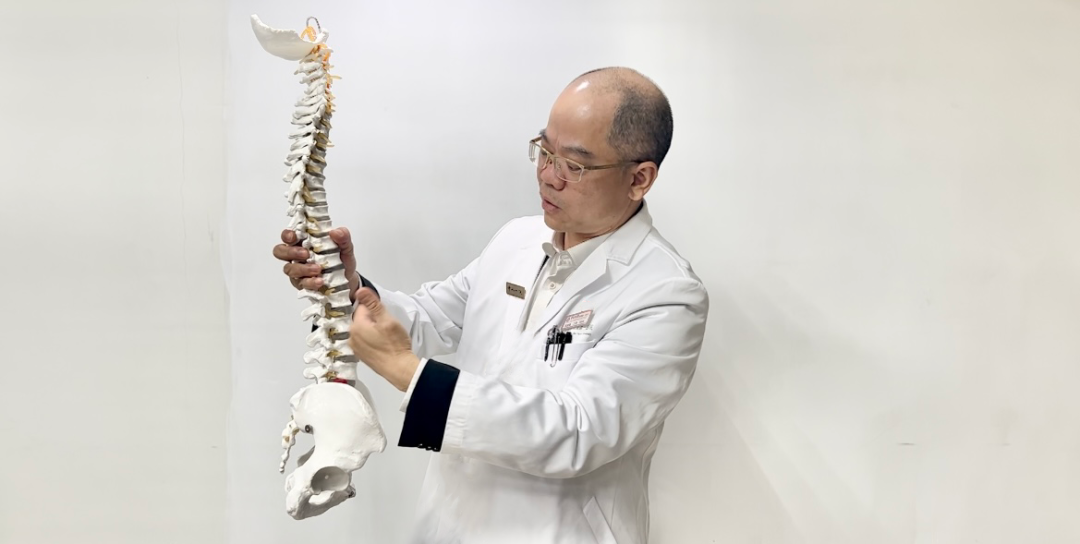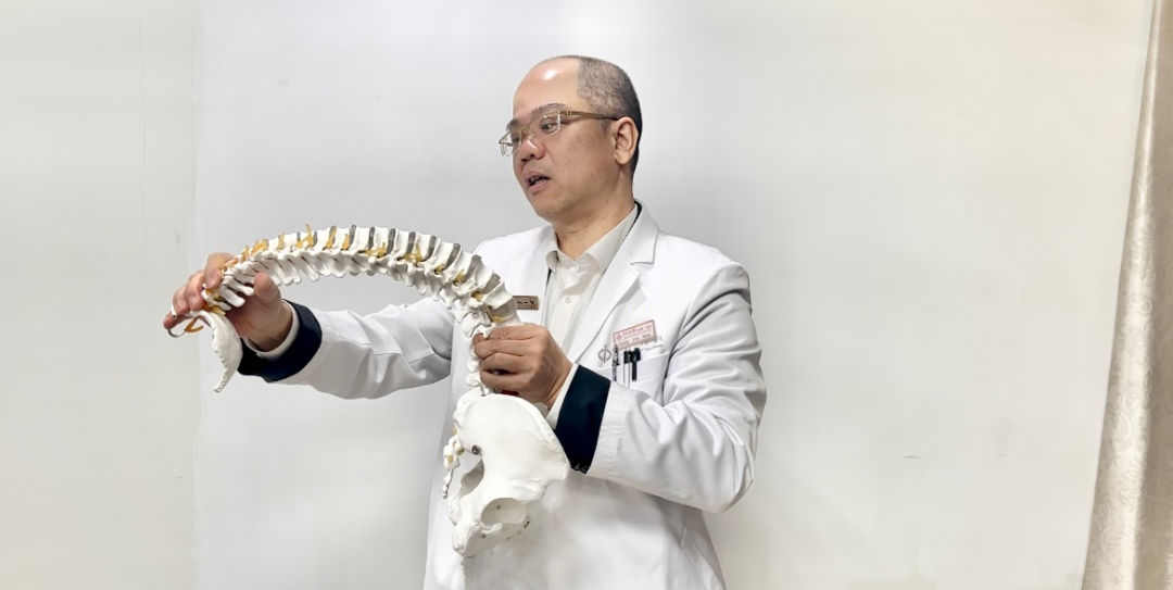 苏培强教授演示:正常状态下,人的颈椎、胸椎和腰椎(由上至下)呈波浪形