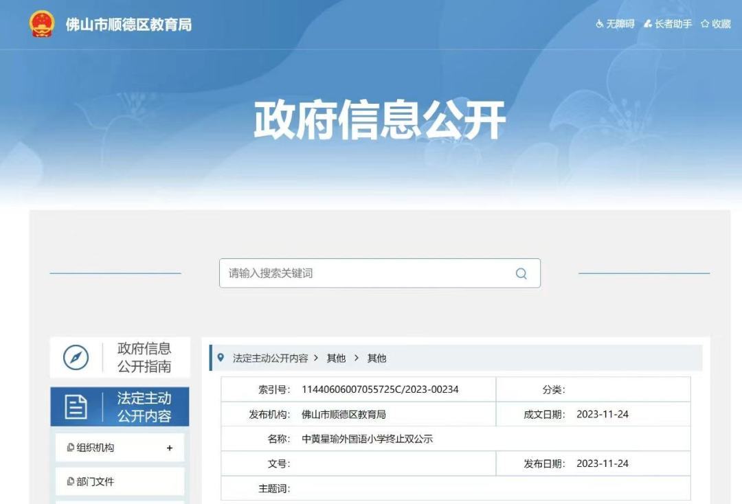 今日,顺德区教育局回复广州日报全媒体记者称,乐从镇提交了“佛山市顺德区乐从镇中黄星瑜外国语小学”拟转设为“佛山市中黄星瑜港澳子弟学校(暂定名)”的请示并获区、市、省同意。根据《民办教育促进法》相关要求,同一地址不得举办两所不同类型的民办学校,因此,顺德区教育局责成申办机构及时办理“佛山市顺德区乐从镇中黄星瑜外国语小学”注销登记手续。具体回复如下: