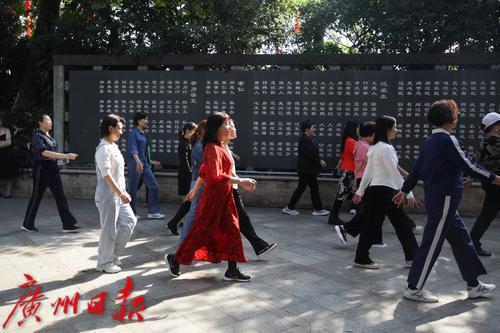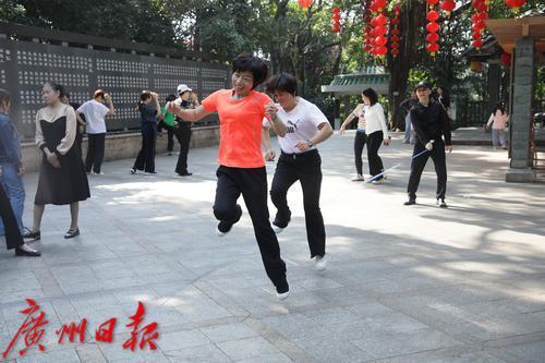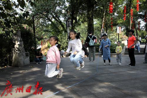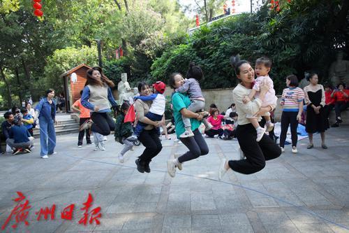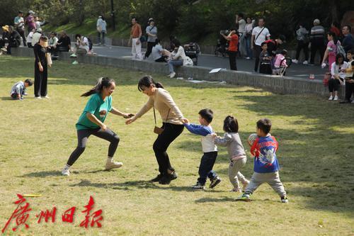 白云山可憩草坪,市民在玩老鹰捉小鸡游戏。