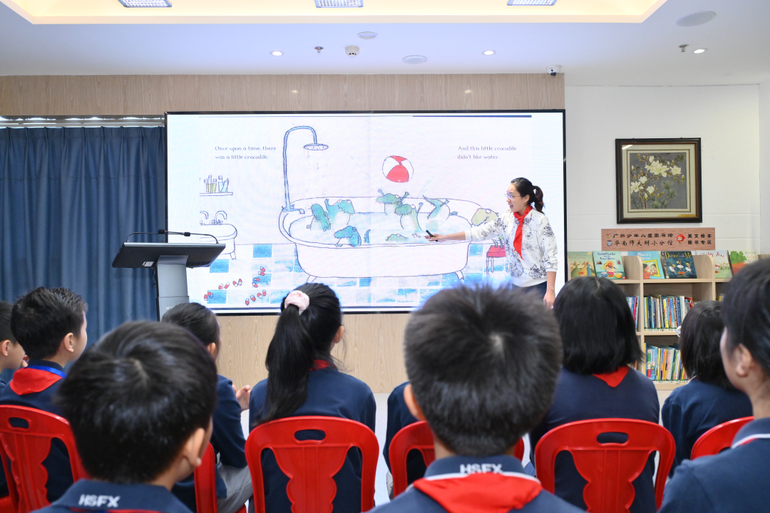随后,在华南师范大学附属小学图书馆,举行了两场阅读教学示范课例,分别是英文绘本阅读教学《不喜欢游泳的小鳄鱼》(The Crocodile Who didn't Like Water)和主题阅读分享课《七彩“悦”读,美好生活》。