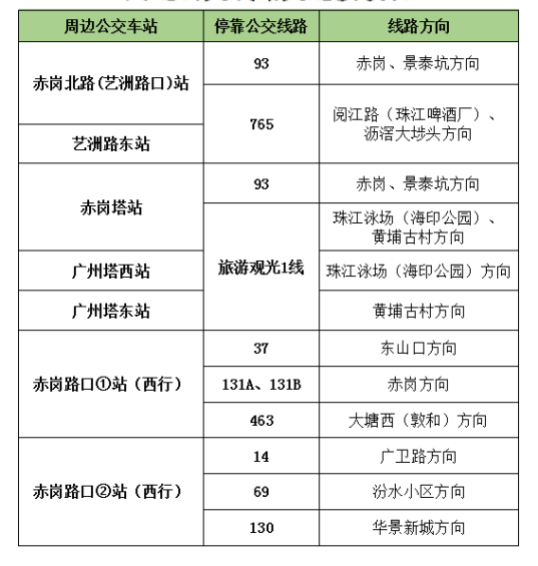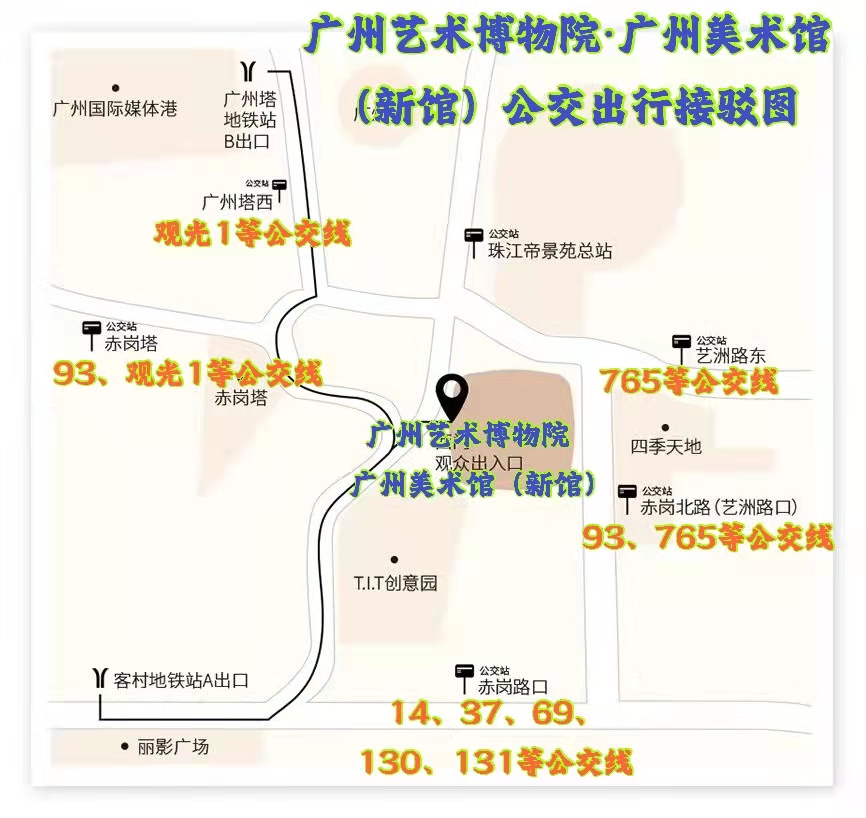 其中,93、765等公交路线停靠的赤岗北路(艺洲路口)站是最接近新馆的公交车站,就在新馆东门对出,下车即到;另外,新馆周边200米范围内有艺洲路东站、赤岗塔站、广州塔西站、广州塔东站等多个公交站点,广大市民均可乘坐一汽巴士三分公司93、765、旅游观光1线等公交线路到达新馆东门和西门入口。