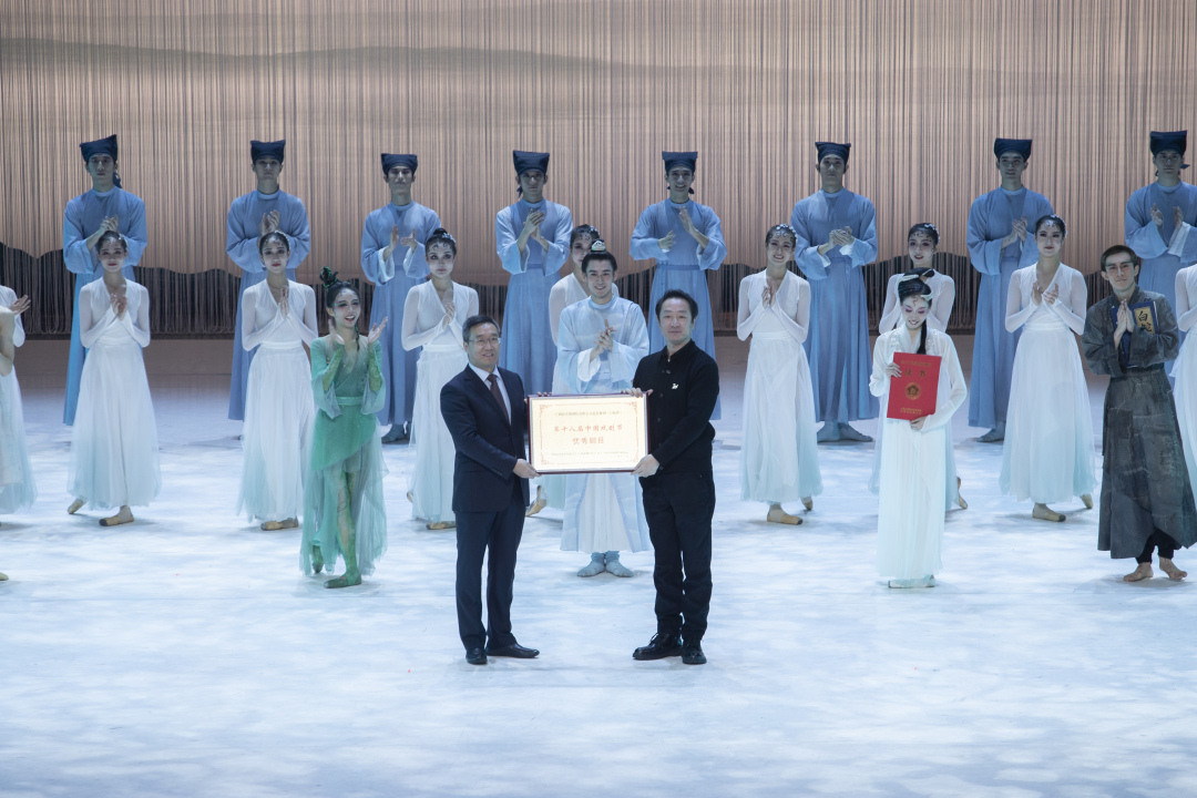 继芭蕾舞剧《旗帜》荣获第十三届中国舞蹈“荷花奖”舞剧奖之后,11月27—28日晚,广州芭蕾舞剧院又一部原创力作《白蛇传》作为第十八届中国戏剧节唯一舞剧,在浙江音乐学院大剧院精彩上演。据悉,该剧也是本届戏剧节中唯一演出两场的作品。演出结束后,中国戏剧家协会分党组成员、副秘书长薛长绪授予《白蛇传》“第十八届中国戏剧节优秀剧目”参演证书和纪念牌。