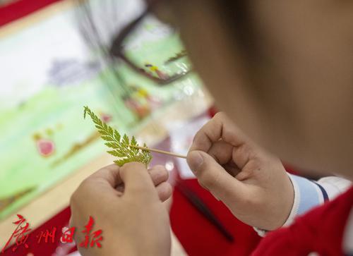 岭南押花艺术代表性传承人傅庆军指导小朋友们制作押花作品。