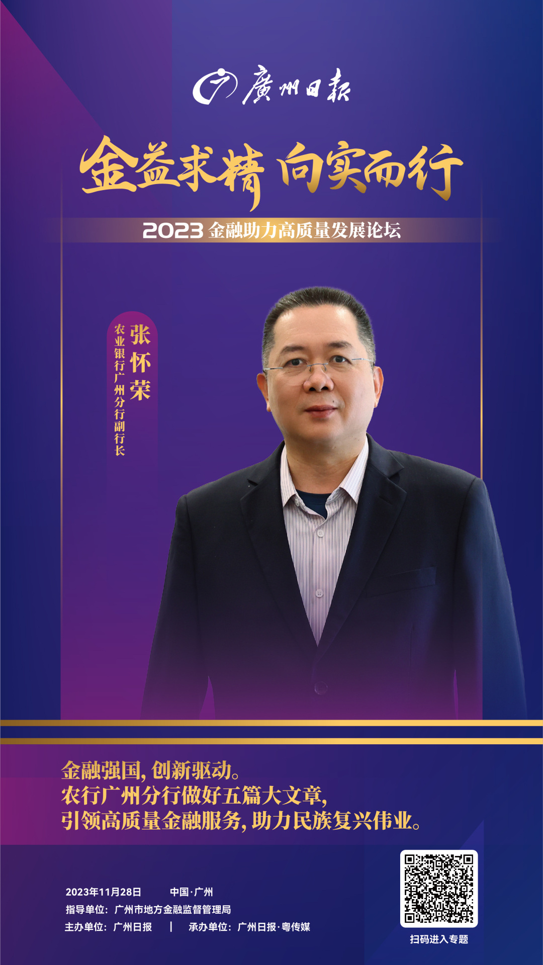 如何理解中央金融工作会议提出的“五篇大文章”?在“五篇大文章”上,金融机构做出哪些亮点举措?为做好“五篇大文章”,接下来该如何发力?11月28日,由广州市地方金融监管局指导、广州日报社主办的“金益求精 向实而行”2023金融助力高质量发展论坛在广州举行。在论坛圆桌环节,专家学者、金融机构代表等聚焦“如何做好五篇大文章”,共话金融高质量发展。农行广州分行副行长张怀荣不仅介绍了广州农行在做好五篇大文章的举措,也对如何做好五篇大文章提出了建议。