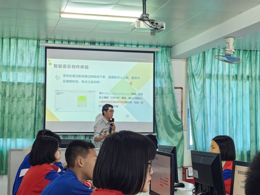 增城中学老师戴俊鑫则带来八年级上册第3课《智能音乐家》的课例展示。通过“AI小恐龙进化”的视频,老师引出人工智能知识“遗传算法”,在“听歌识曲”“哼唱识别”和“听音辨人”活动中,带领学生对比人类智能和人工智能,渗透AI音乐应用基础。老师还安排了体验环节,利用相关平台带领学生开展AI创作音乐和分享活动,激发学生体验和应用人工智能进行创作的意识和兴趣。