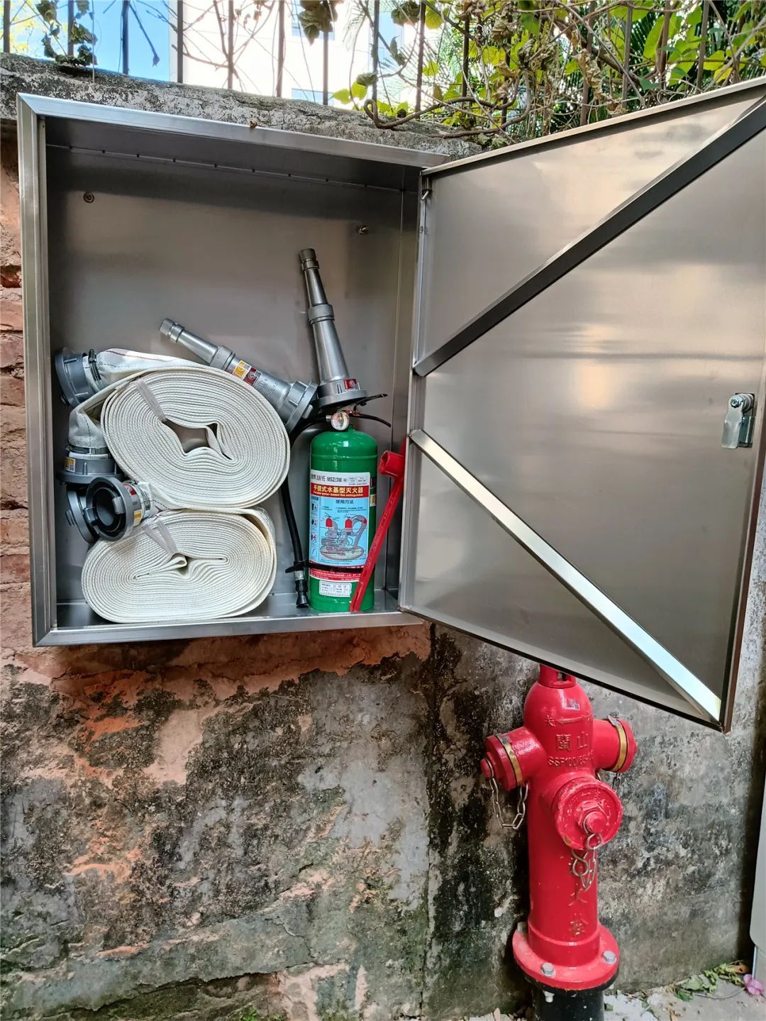 永福西约72号门口围墙新配备上的消防栓箱。