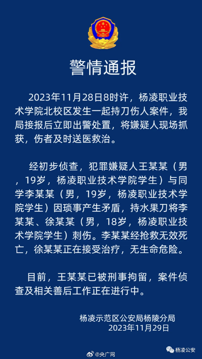29日,陕西杨凌警方通报“一职业学校发生持刀伤人案件”:28日8时许,杨凌职业技术学院北校区发生一起持刀伤人案件,杨凌示范区公安局杨陵分局接报后立即出警处置,将嫌疑人现场抓获,伤者及时送医救治。经初步侦查,犯罪嫌疑人王某某(男,19岁,杨凌职业技术学院学生)与同学李某某(男,19岁,杨凌职业技术学院学生)因琐事产生矛盾,持水果刀将李某某、徐某某(男,18岁,杨凌职业技术学院学生)刺伤。李某某经抢救无效死亡,徐某某正在接受治疗,无生命危险。目前,王某某已被刑事拘留,案件侦查及相关善后工作正在进行中。