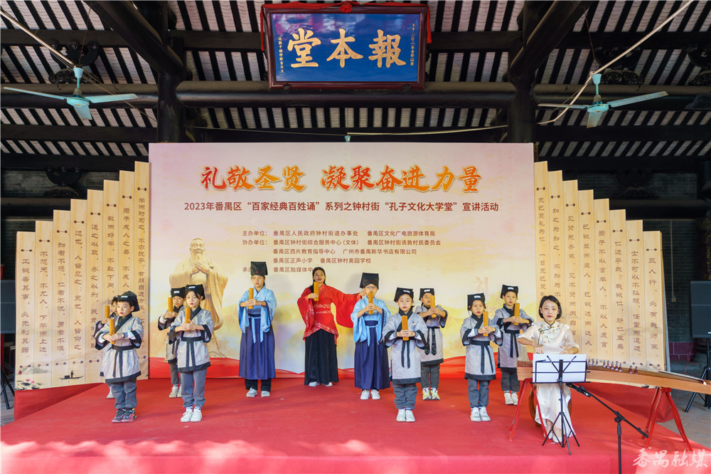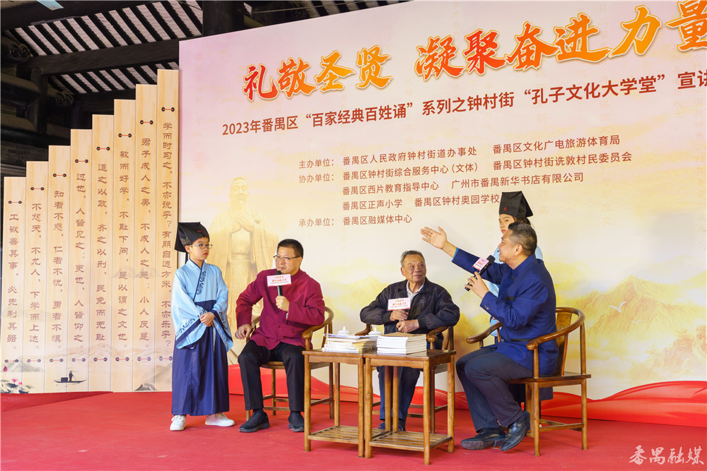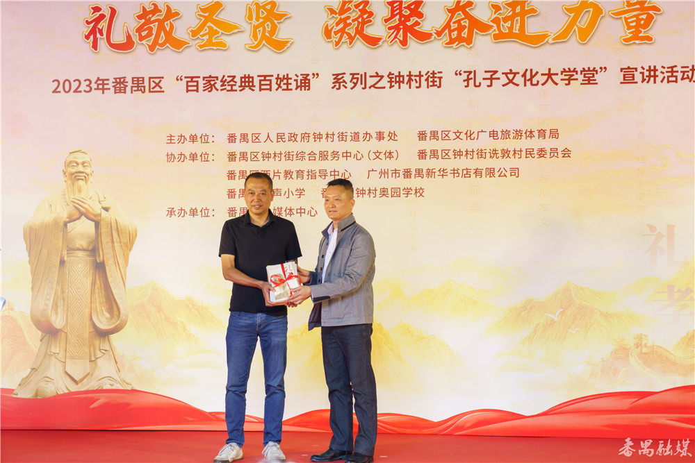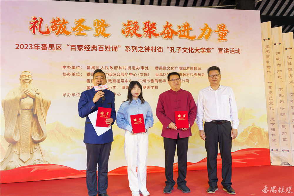 此外,活动还进行了2023年番禺区“百家经典百姓诵”系列之钟村街孔子文化大学堂宣讲“公益讲师”受聘仪式,番禺区文化广电旅游体育局原局长、广府文化研究学者何穗鸿,番禺区融媒体中心副主任林劲,番禺区正声小学老师林思嘉等人受聘为“公益讲师”,为传承儒家文化、弘扬社会正气注入了新的力量。