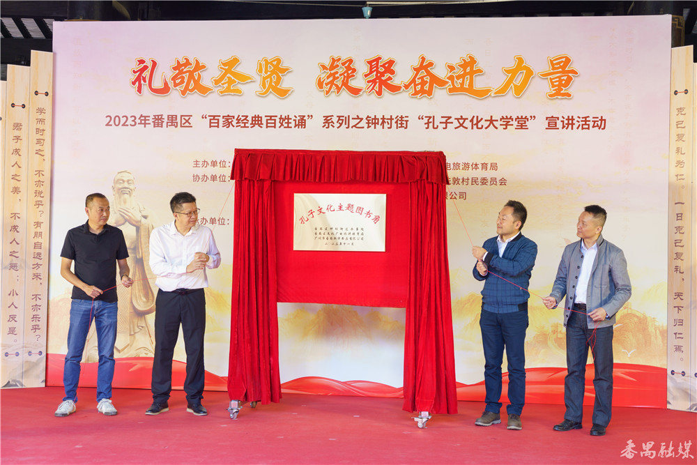 活动中,诜敦孔氏子弟、番禺区正声小学及番禺区钟村奥园学校的孩子们与老师首先进行了经典诵读《论语》片段,展现了儒家文化的深厚底蕴。随后,领导嘉宾共同为诜敦村“孔子文化主题图书角”揭牌,广州市番禺新华书店有限公司向孔子文化主题图书角捐赠了56本书籍,包括儒家文化、党政等方面的内容,为村民和学生提供了丰富的阅读资源。