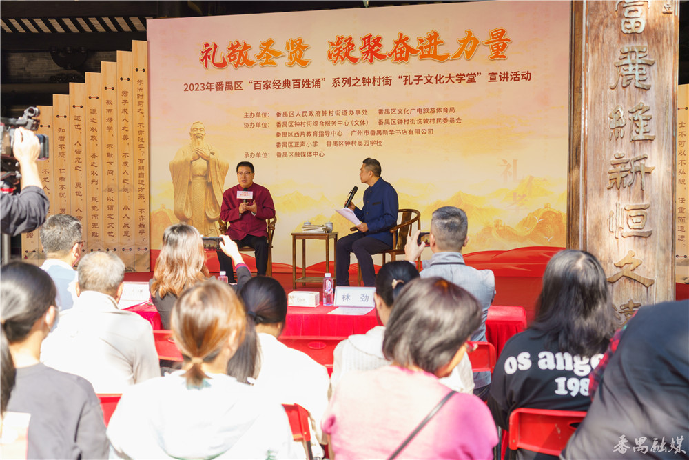11月28日上午,番禺区“百家经典百姓诵”系列之钟村街“孔子文化大学堂”宣讲活动在钟村街诜敦村天南圣裔祠举行。此次活动由番禺区钟村街道办事处、番禺区文化广电旅游体育局主办,番禺区融媒体中心承办。活动以“礼敬圣贤 凝聚奋进力量”为主题,旨在弘扬优秀传统文化,倡导和培育向上向善、刚健朴实的文化氛围。钟村街党工委书记张靖鹰,番禺区文广旅体局党组成员、副局长陈波,以及其他相关领导出席了本次活动。