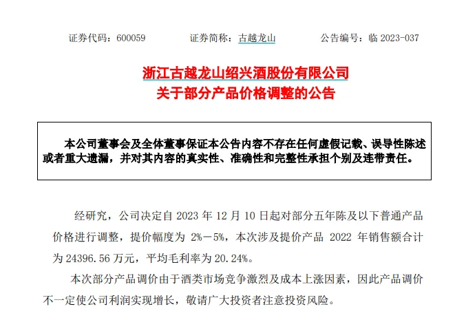 公告显示,古越龙山决定自2023年12月10日起,对部分五年陈及以下普通产品价格进行调整,提价幅度为2%-5%。本次涉及提价产品2022年销售额合计为2.4亿元,平均毛利率为20.24%。