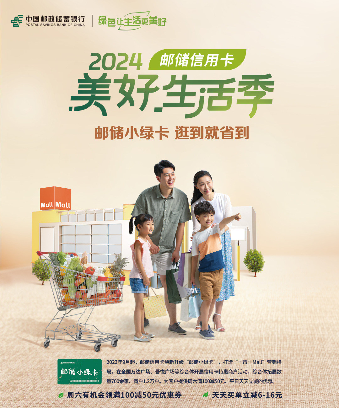 2023年9月起,邮储信用卡焕新升级“邮储小绿卡”,打造“一市一Mall”营销格局,在万达广场等综合体开展信用卡特惠商户活动,为客户提供周六满100减50元、平日天天立减的优惠。邮储银行广州市分行坚持服务国之所需、民之所向,在12月底前联合苏宁易购开展“你买单,我助力”24期免息分期活动,引起良好的市场反响,以更低的价格、更给力的活动、更优质的服务,让客户逛到、省到!