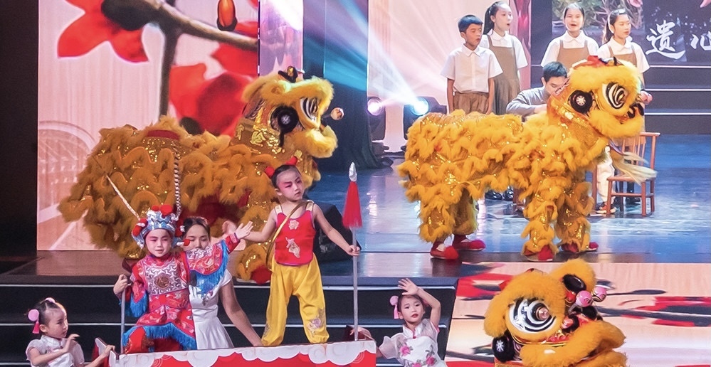 此次展演采取情景剧的全新表演形式,构思巧妙新颖。LED大屏播放非遗项目,舞台上孩子们演绎非遗经典,拓展文化传播场景,活灵活现、威风凛凛的舞狮表演,精美绝伦的沙湾飘色,一批非物质文化遗产项目轮番登场,呈现出了一台充满正能量,富有童趣的演出,体现了非遗“见人、见物、见生活”的活态传承。歌曲融合广东音乐元素,在传统编曲基础上,结合当下流行表演元素,配合孩子们清澈干净的吟唱,更容易被观众接受与传唱,助力青少年一代讲好广东故事,传唱非遗文化,在文化自信中实现文化自强,推动少年儿童成为中华传统文化保护传承的生力军。