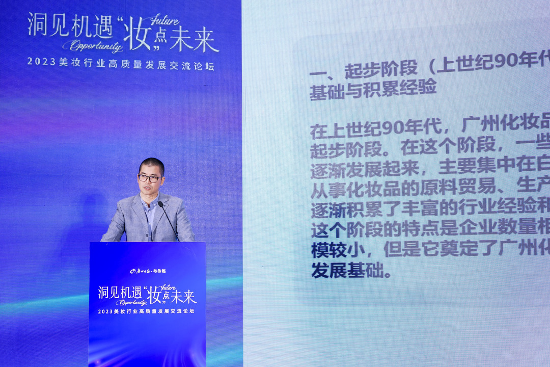 诚然,美妆行业挑战与机遇并存,想先人一步抓住机遇,需要结合产业发展现状,研判产业发展趋势,积极把握市场动向。广州市社会科学院现代产业研究所副研究员陈峰在会议现场带来了《广州美妆行业高质量发展的实践与展望》主题演讲。针对“广州作为美妆产业全国第一城市,为何能够领跑全国”,陈峰剖析归纳为五大要点:一是地理位置优越;二是强大完备的产业链;三是雄厚的人才基础;四是紧抓社交媒体的红利;五是政府支持与政策引导。