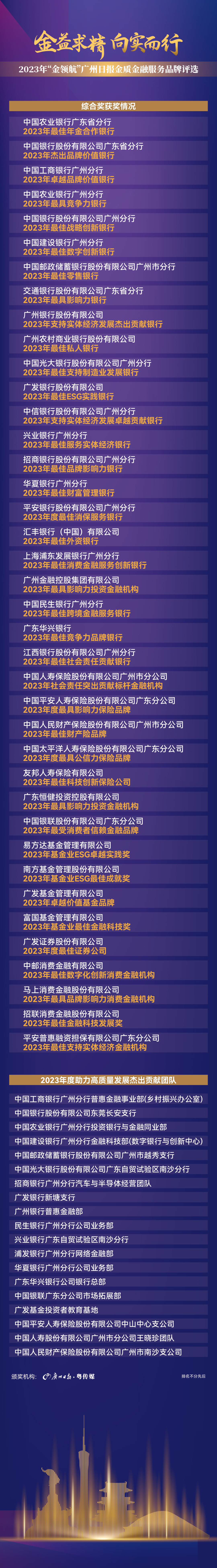 各家金融机构经材料申报、资质审核、读者点赞支持的层层评选流程,共同揭晓了获奖名单。在此次金质金融服务品牌评选中,共有42家金融机构获综合奖,19家金融单位获2023年度助力高质量发展杰出贡献团队奖。在11月28日举行的由广州日报主办的2023金融助力高质量发展论坛中举行了颁奖仪式,各家获奖单位共贺金融高质量发展成效。