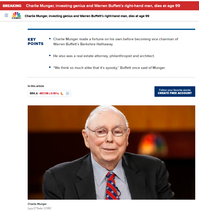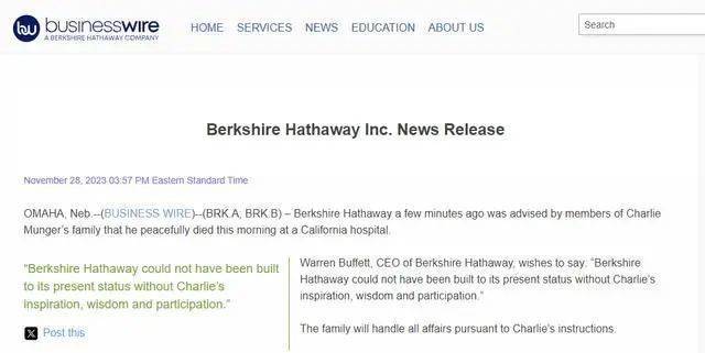 当地时间周二(11月28日),伯克希尔-哈撒韦在其子公司美国商业资讯网站上发布声明表示,董事会副主席查理·芒格(Charlie Munger)的家人几分钟前告知公司,芒格于当天早上在加州的一家医院中安详去世,享年99岁。距离其100岁生日仅有1个多月。