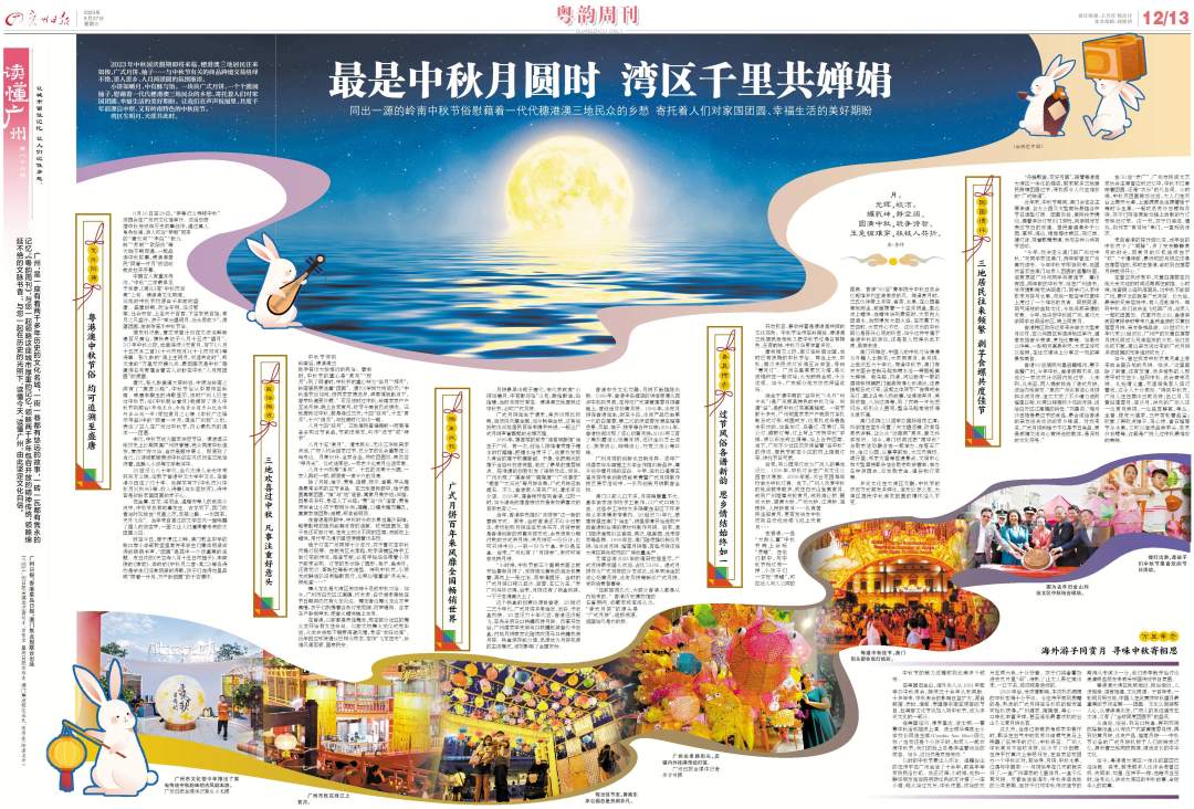2023年9月27日,中秋佳节前夕,《广州日报》、香港《星岛日报》、澳门《澳门焦点报》三家媒体首次携手合作,推出三地中秋节历史探源的报道《最是中秋月圆时 湾区千里共婵娟》,描摹了穗港澳三地民众在面对“湾区升明月,天涯共此时”的特殊时刻所产生的共同乡愁,该文也标志着《粤韵周刊》由此走进了粤港澳大湾区更多地方。