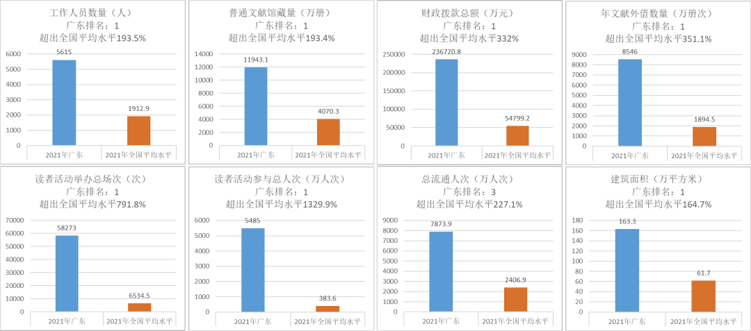 整体而言,广东公共图书馆事业有力地保持了蓬勃发展的态势,服务体系建设覆盖城乡、设施建设提档升级、经费保障均衡有力、文献信息资源持续优化、专业人才队伍不断壮大、服务效能显著提升。广东公共图书馆事业积极响应高质量发展要求,有效地推动了公共图书馆的品质发展、均衡发展、开放发展和融合发展。广东公共图书馆事业在读者服务、空间营造、科技应用和形象展示方面取得了优异成绩,真正建成了一大批“以人为中心”的图书馆。