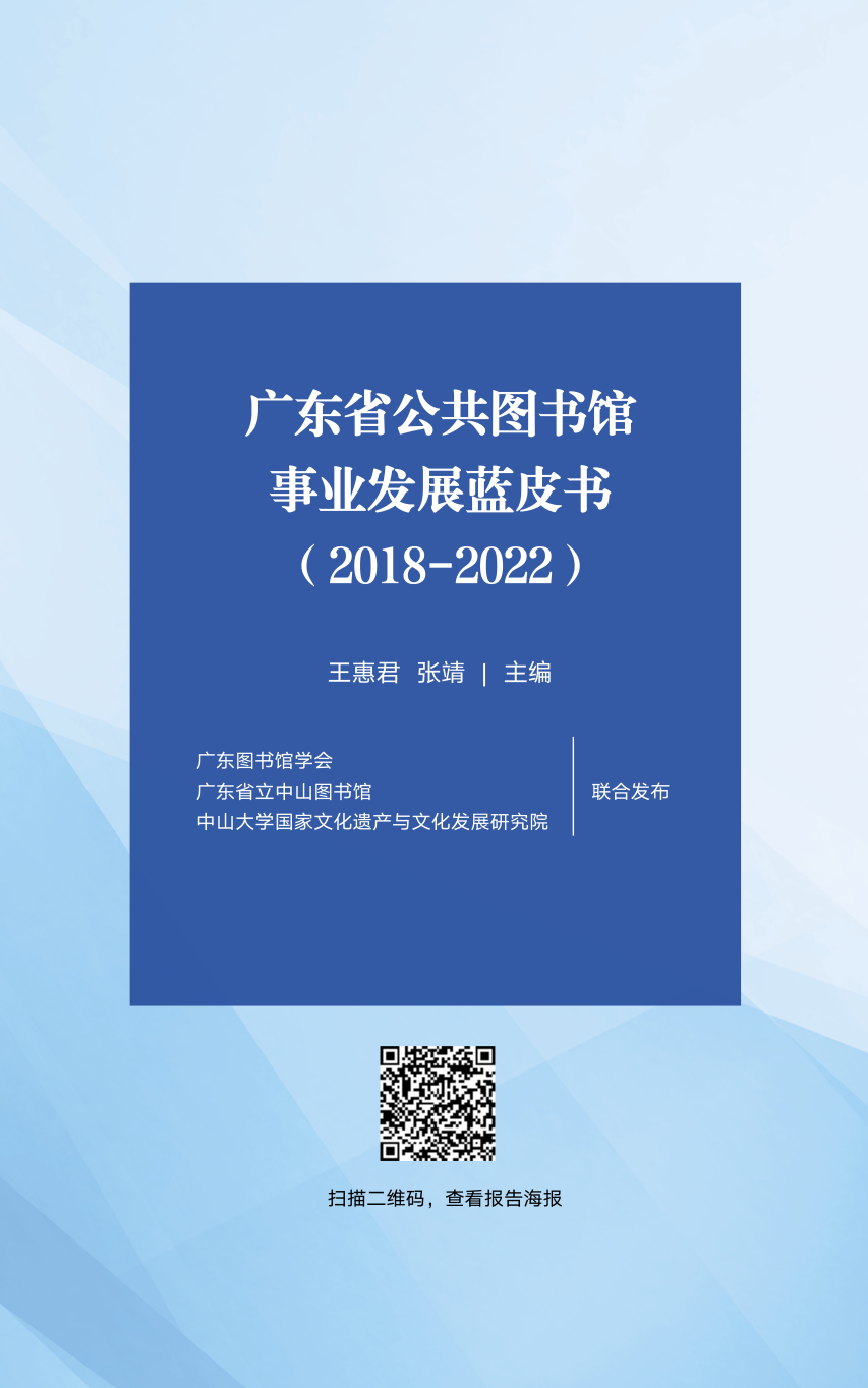《广东公共图书馆事业发展蓝皮书(2018-2022)》由广东图书馆学会理事长、广东省立中山图书馆王惠君馆长和广东图书馆学会副理事长、中山大学国家文化遗产与文化发展研究院张靖教授担任主编,由中山大学出版社正式出版,同时,反映各篇报告主要内容的18张海报在线上线下同步展出,欢迎关心公共图书馆事业发展的各界人士,共同见证广东公共图书馆事业的蓬勃发展。