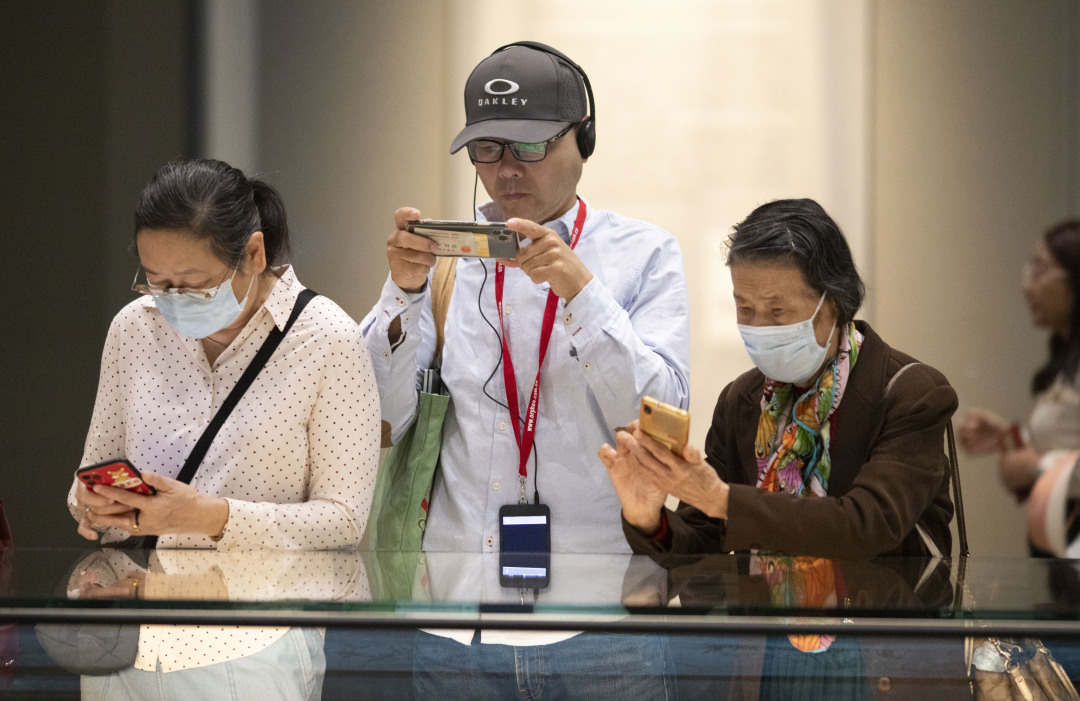 早上8点30分,距离正式开馆还有半小时,新馆的外围和各个入口处已经聚集了不少观众,大家纷纷举起相机拍下珠江畔这一造型独特的新地标建筑。接近9点,新馆西门外的第一批观众入场,他们在门口核验预约码后进入馆内。