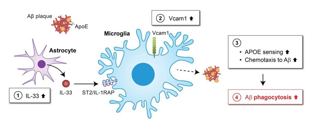 研究团队深入研究小胶质细胞如何控制Aβ的清除以及它们在阿尔兹海默病中功能受损的原因。研究团队发现,小胶质细胞上的一种细胞表面蛋白VCAM1不但介导小胶质细胞向Aβ迁移,还促进小胶质细胞清除Aβ。团队还发现,Aβ斑块中的APOE蛋白与VCAM1蛋白的相互作用是引导小胶质细胞向Aβ斑块靠近的关键。团队进一步发现,在阿尔兹海默病小鼠模型中激活「VCAM1-APOE」通路可减轻阿尔兹海默病的病理症状。这些发现表明,正常的VCAM1功能对于小胶质细胞迁移和清除Aβ至关重要。