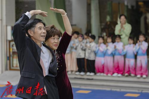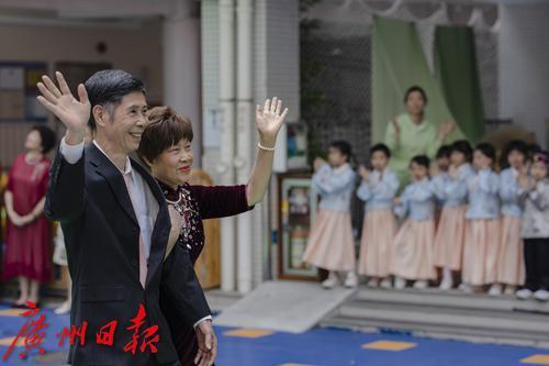 孩子们的爷爷奶奶在幼儿园里走秀。