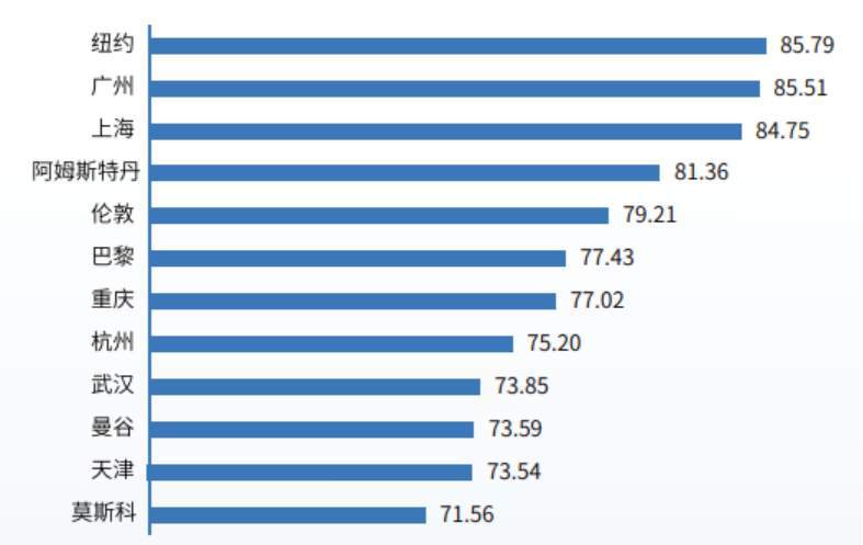 融合活力延续2022年指标评价体系,综合衡量产城融合、文旅融合两项二级指标,同时顾及产业、城市与文化之间的关系。排在融合活力指标前五名的城市分别为纽约、阿姆斯特丹、广州、上海、天津。