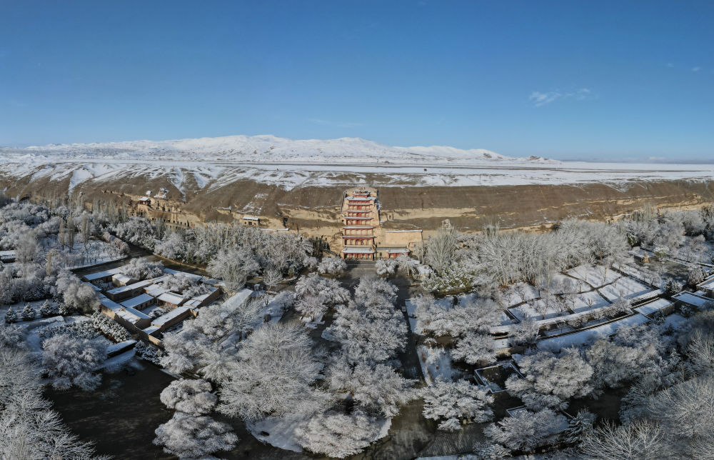 这是2022年3月25日拍摄的敦煌莫高窟景区雪景(无人机照片)。新华社记者张智敏 摄