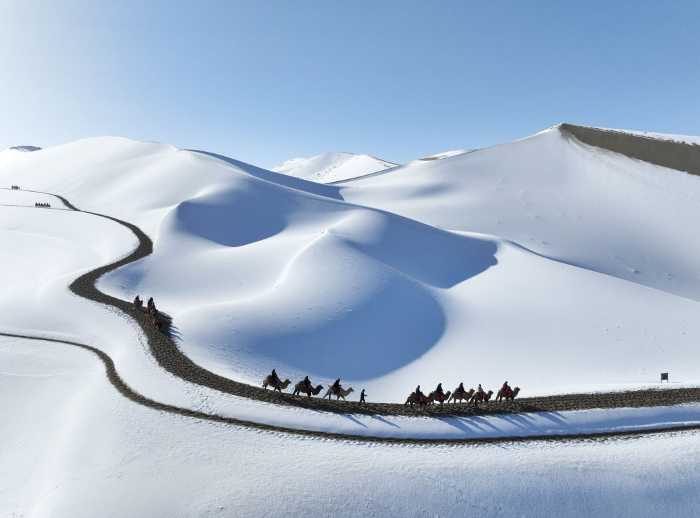 11月15日,游客在鸣沙山月牙泉景区欣赏雪景(无人机照片)。新华社发(张晓亮摄)