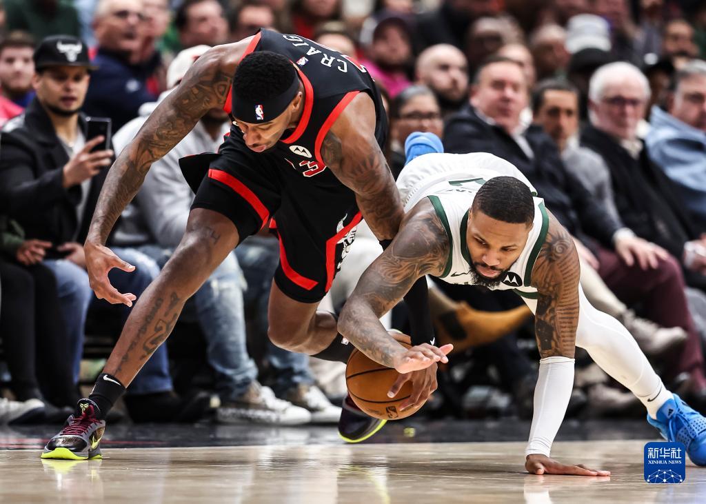 11月30日,雄鹿队球员利拉德(右)与公牛队球员克雷格在比赛中争抢球。新华社发(乔尔·莱纳摄)