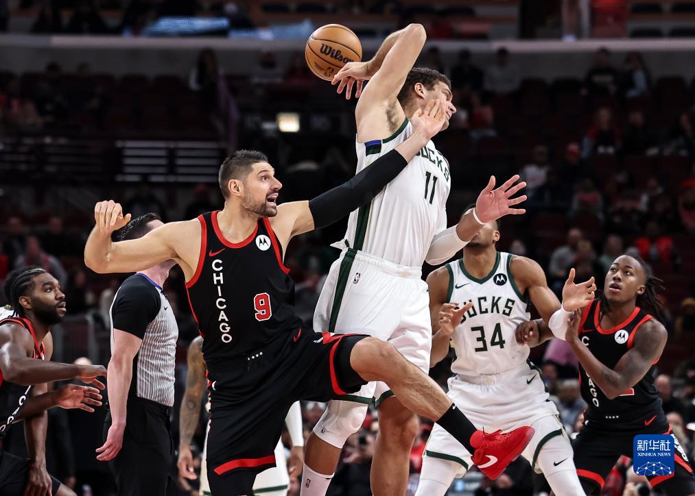 11月30日,雄鹿队球员洛佩兹(中)与公牛队球员武切维奇(前左)在比赛中争抢球。新华社发(乔尔·莱纳摄)