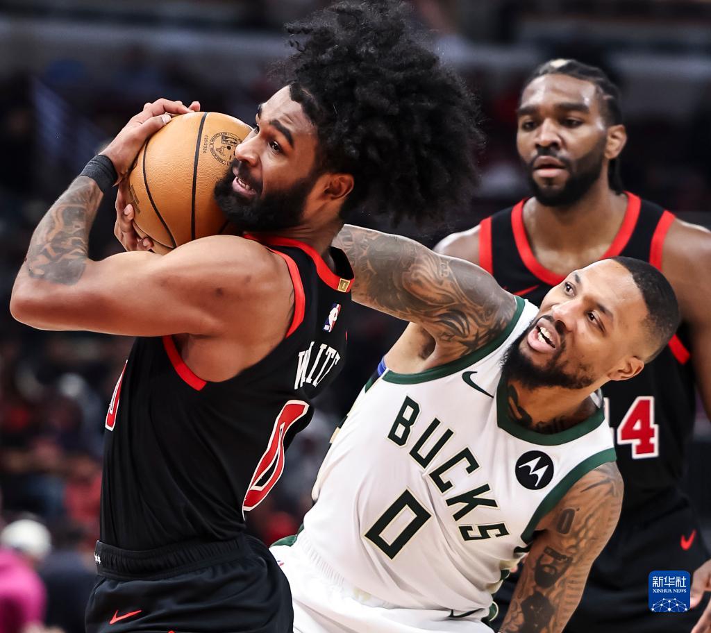 11月30日,公牛队球员怀特(左)与雄鹿队球员利拉德在比赛中拼抢。新华社发(乔尔·莱纳摄)