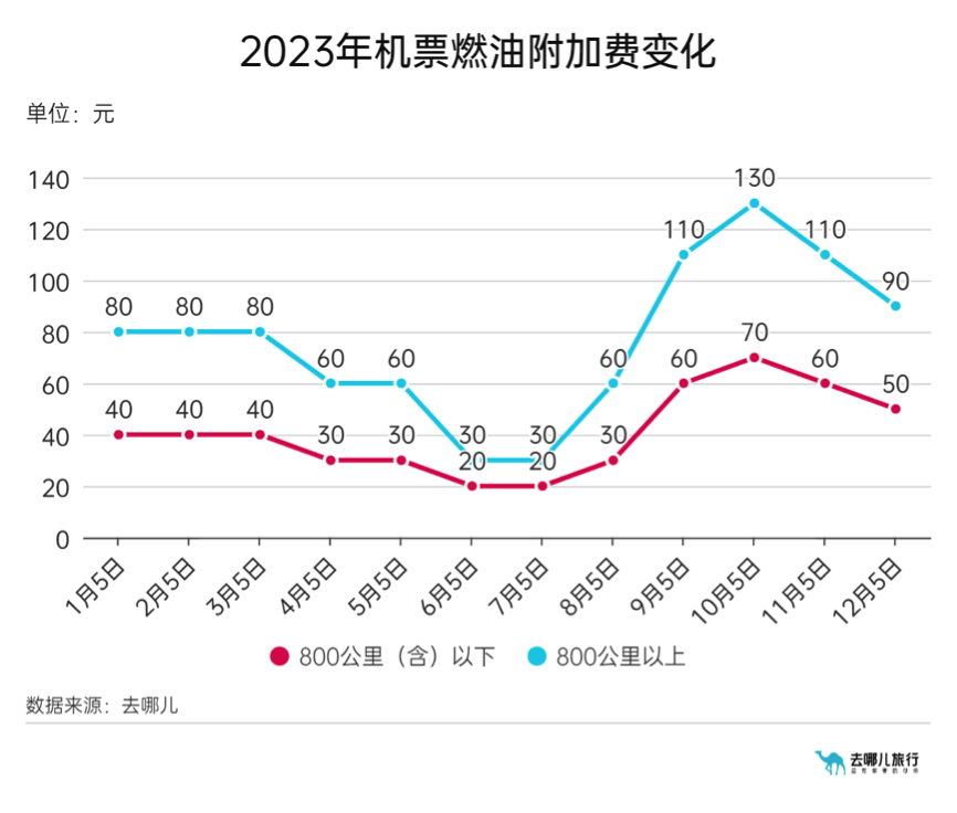 12月1日,记者从“去哪儿”平台了解到,该平台已接到航空公司消息:自2023年12月5日(出票日期)起,成人旅客:800公里(含)以下航线每位旅客收取50元燃油附加费,800公里以上航线每位旅客收取90元燃油附加费。相较于调整前分别降低了10元和20元。