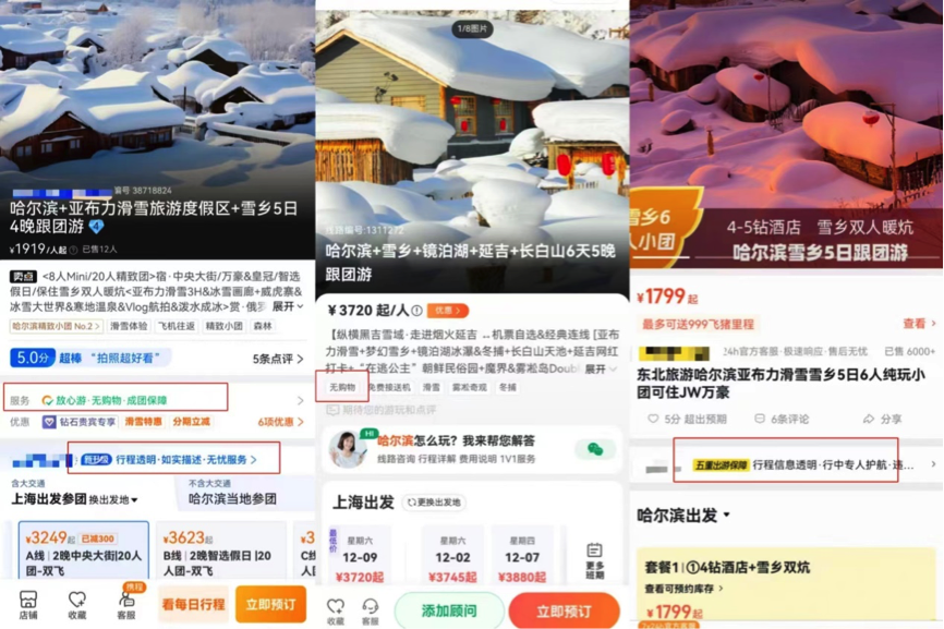 在正规OTA平台上,无购物的纯玩团,以及消费者参团的保障其实是清楚标明在产品页面的,一般会标注“无购物”“成团保障”“放心游”等字眼。消费者可以仔细阅读这些保障来维护自己的权益。例如有旅行社针对跟团行程中的“食住行游购娱”五个环节分别列出相应标准及违规赔付措施,如果酒店安排不符、行中强制购物等,旅行社都会按规定给客人支付赔偿。
