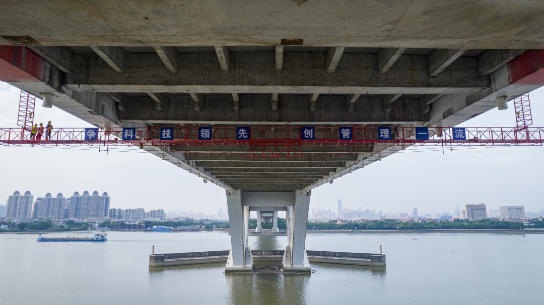 新光快速路上跨越珠江沥滘水道(主航道)、连接海珠区与番禺区的新光大桥让许多出行市民印象深刻,不仅因其串起珠江两岸交通往来,还由于其连续三跨的独特造型。其高73米的主跨如腾飞的大雁振翅珠江,红色钢拱又如跃出水面的彩虹,气势磅礴、宏伟壮观。“新光大桥更是具有标志性的桥梁,是国内、也是世界首座由钢拱与V型刚构组合而成的三跨‘飞雁式’中承连续刚构钢箱桁系杆拱桥”新光大桥景观整饰工程项目负责人张语栖告诉记者。