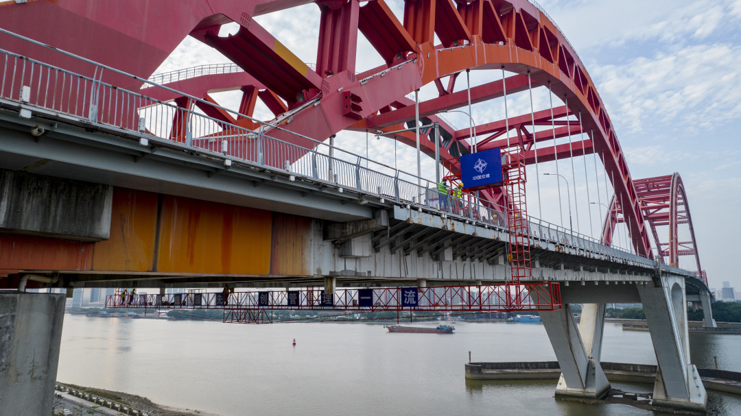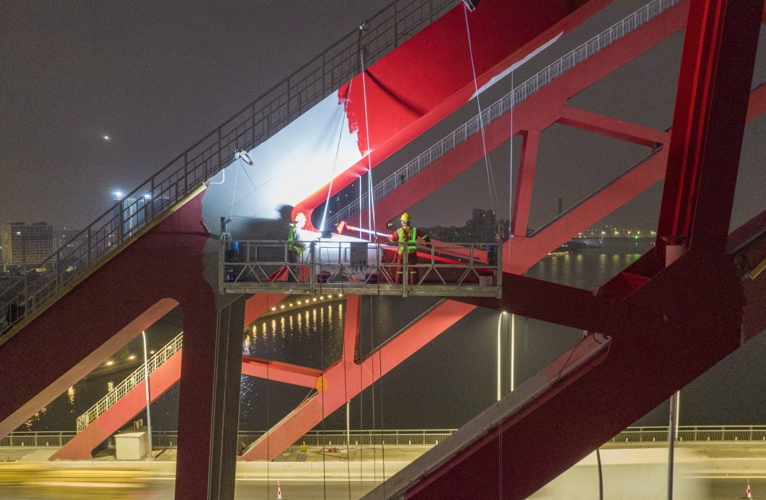 据悉,进行桥底作业时,工人们将利用桥梁旁边的防撞岛作为施工平台,对桥梁下部结构可能存在的裂缝进行裂缝封闭施工,同时进行结构检测,并根据检测结果开展下一步工作。在引桥钢拱保养维修时,工人们将通过高空车和“蜘蛛人”完成相关工作。
