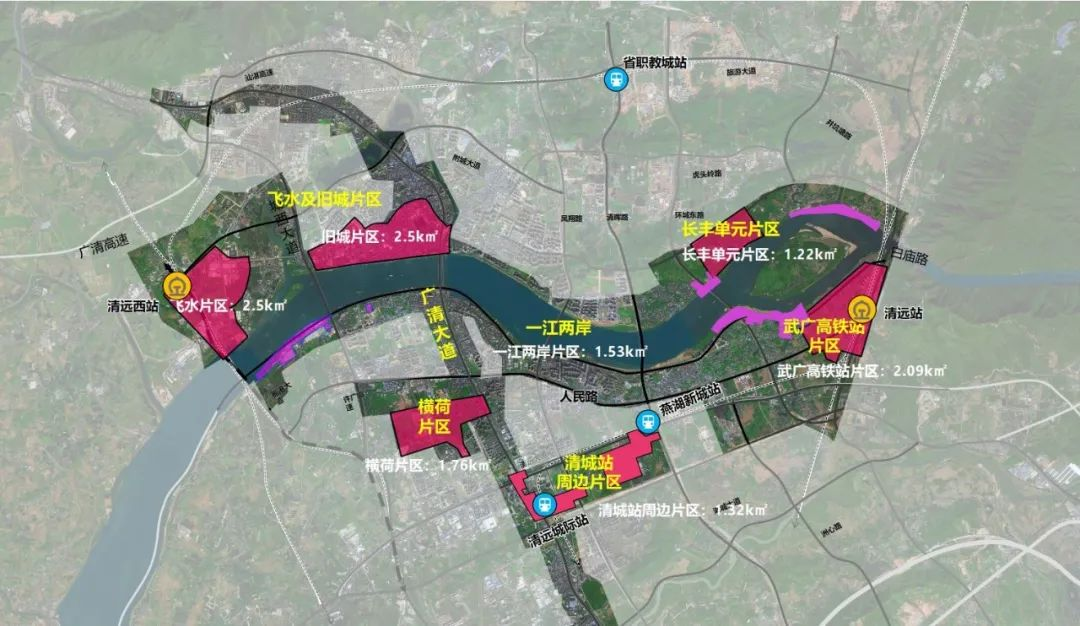 飞水及旧城片区、武广高铁清远站周边及长丰单元周边片区、城际轨道清城站周边片区、横荷片区;一江两岸及广清大道廊道。