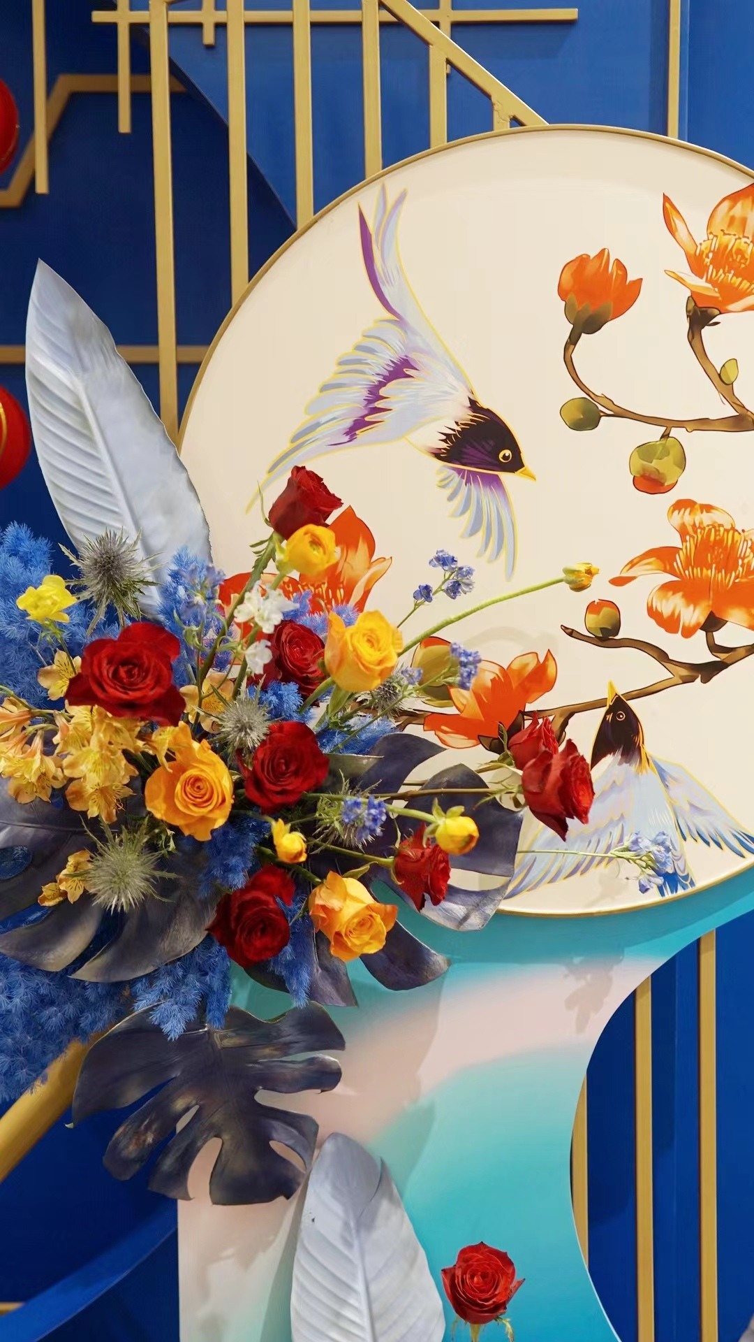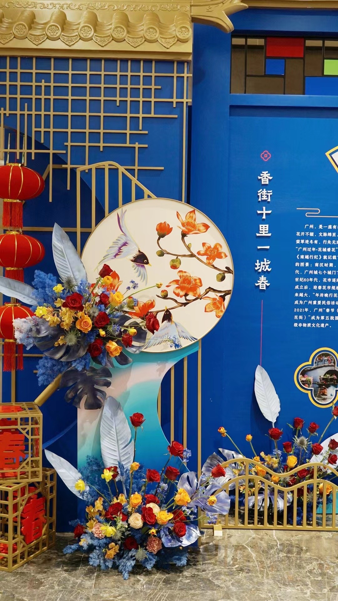 广报策展主创设计介绍,展览整体设计与“读懂中国”国际会议(广州)主视觉相融,造型则以传统花市牌楼为灵感, 结合特色鲜花花艺,营造出新春花市的氛围,同时点缀以广绣、醒狮等岭南非遗元素。