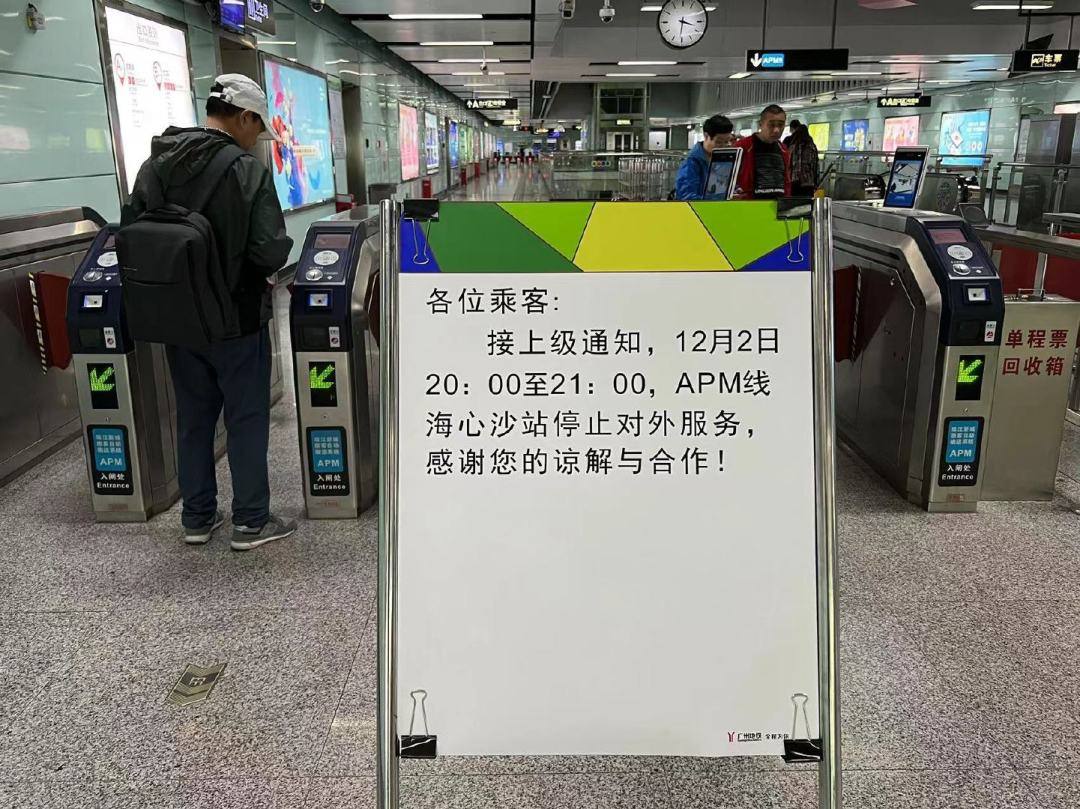 广州地铁通报,接上级通知,12月2日20时至21时,APM线列车将在海心沙站不停站通过,需要在海心沙站进出站及前往海心沙周边区域的市民请留意。