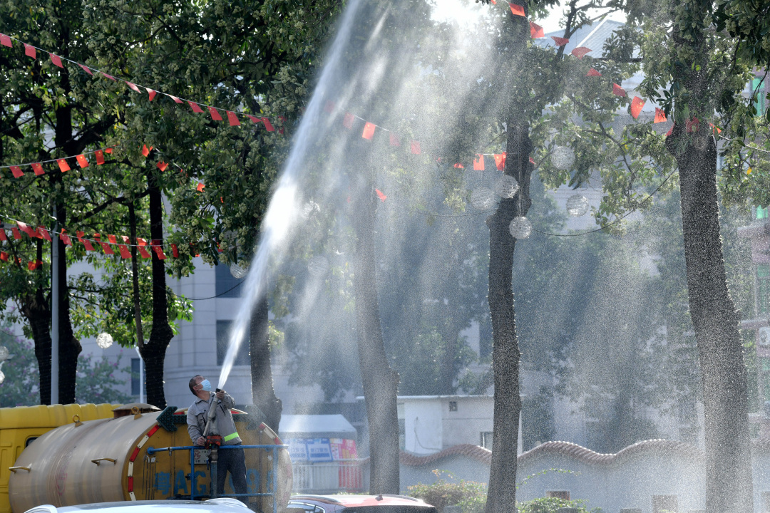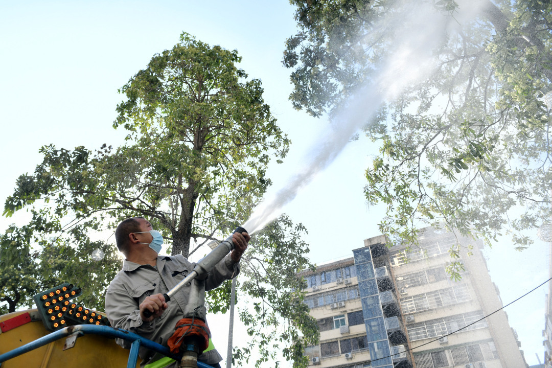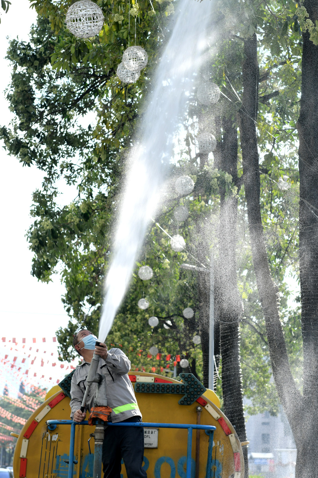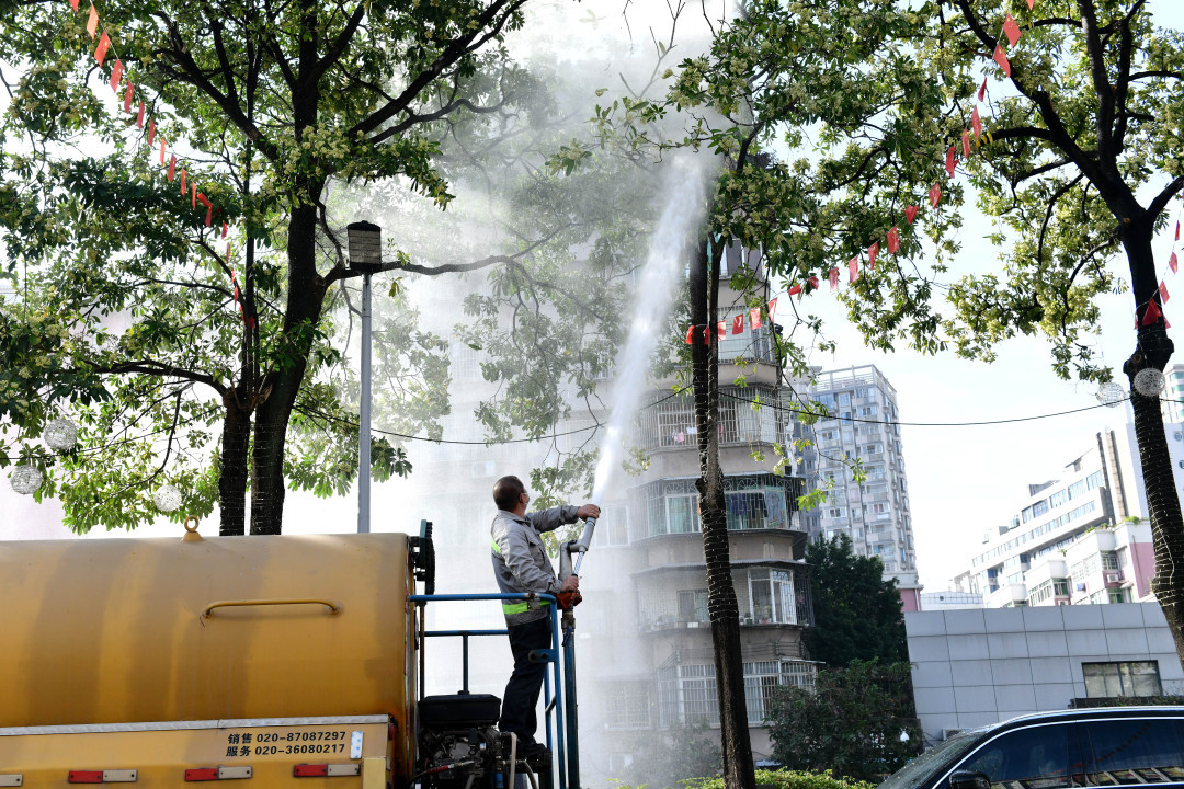如果不能绕路走,是不是还要顶着“攻鼻”的气味前行?未必。今天下午,林园部门就安排工作人员驾驶水车,使用高压水枪对糖胶树进行“冲刷”。记者在现场看到,水车在寺右一马路上根据引导缓慢前行,车上一名工作人员操纵高压水枪冲喷路旁的糖胶树花朵。几分钟时间,对一棵树的处理就已经基本完毕,不少糖胶树花朵掉落在地上。越秀区绿化养护第二工区养护班王坤云副班长告诉记者,目前他们主要采取这种方式对市政道路旁的糖胶树进行处理,“这样做可以让糖胶树花粉减少,也可以缩短它的花期。”住在附近的市民罗小姐看到工作人员冲喷糖胶树,忍不住掏出手机拍摄起来,“平时感觉味道很浓烈,特别是在夜间,冲刷之后味道是淡了些。”
