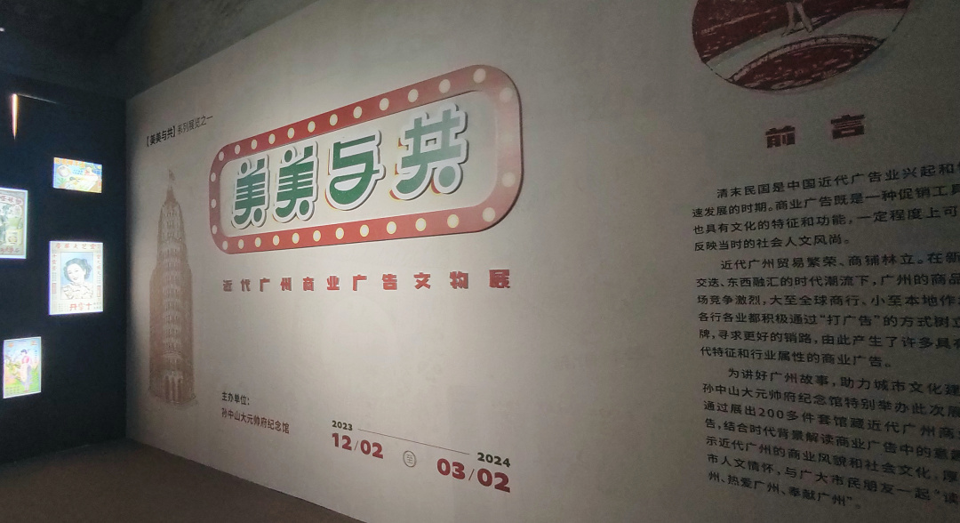 2023年12月2日,由孙中山大元帅府纪念馆主办的“美美与共”系列展览之一“美美与共——近代广州商业广告文物展”在大元帅府北楼三楼临展厅正式开展。