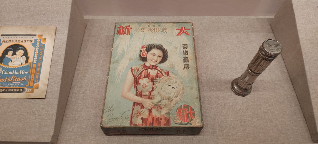 1914年,广东华侨蔡昌、蔡兴兄弟在惠爱路(今中山五路)开设大新公司,又称“城内大新”。1918年,大新公司在广州西堤开设支行,称“西堤大新”或“城外大新”。西堤大新的建筑楼高12层,建成时是广州的最高楼,布局新颖,设计独特,内设天台花园大游乐场和亚洲大酒店。1954年更名为南方大厦。展览展出的一张商标广告以西堤大新公司建筑结合太阳的图案为中心,呼应其英文名称“THE SUN”,表达西堤大新公司蒸蒸日上的愿景。这其实是连锁经营的一种早期形式。