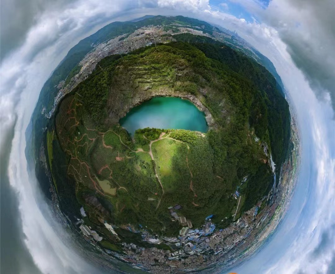 行走到山顶,感受清劲山风,听着潺潺水声,俯瞰蔚蓝的“天池”。山水之间,如梦幻仙境一般。六片山原本是一个采石场,涌出的地下水富含矿物质,使得湖水呈现独特的蓝绿色,引来无数徒步爱好者、摄影发烧友前来打卡,也成为广州市久负盛名的徒步线路之一。鱼眼镜头下的六片山,犹如一只眼睛,因而六片山就有了“广州之眼”“白云天池”的美誉。